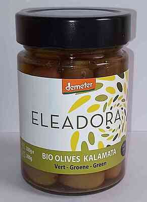 ELEADORA DEMETER KALAMATA OLIVES VERTES, dénoyautées, JUMBO 181-200, 320g/200g égoutté biologique, BE-BIO-02